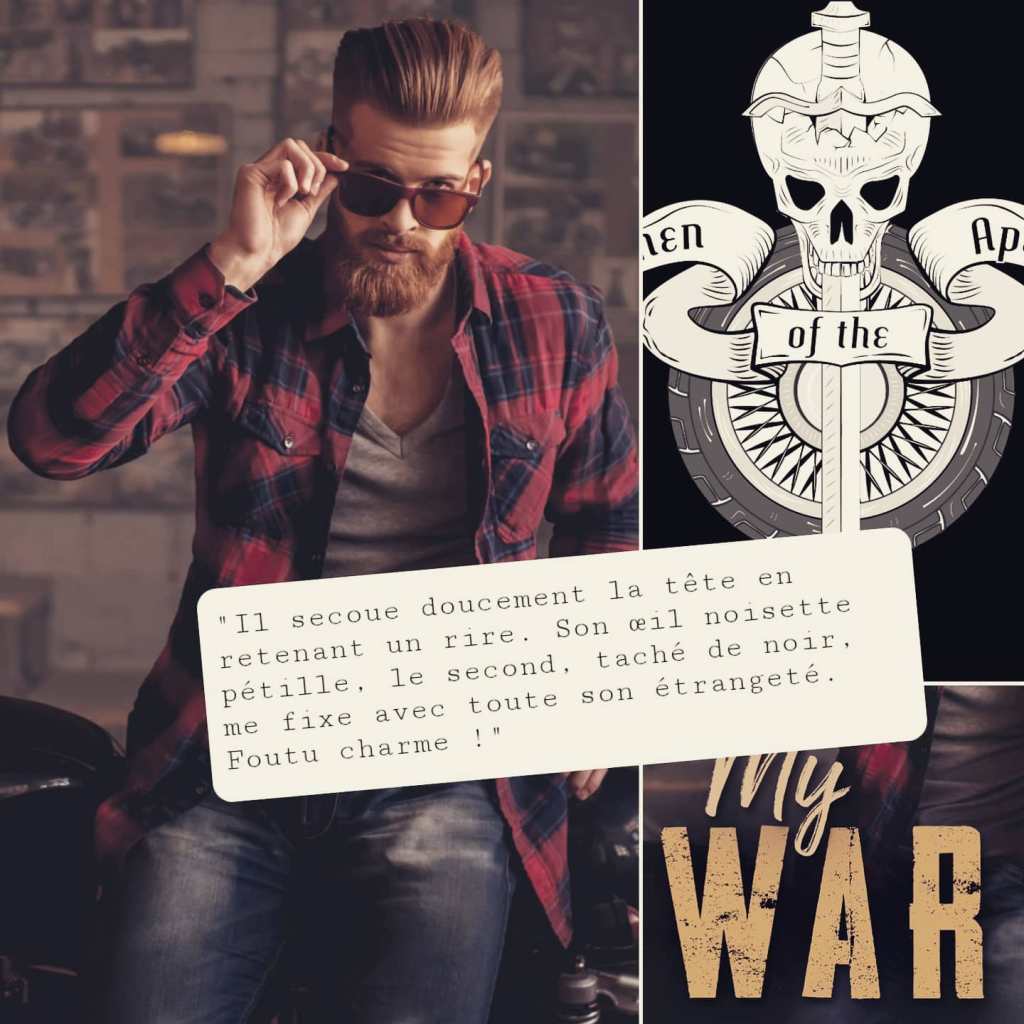 Ce que j’ai aimée … ou pas … : War a toujours tout fait pour ne pas impliquer Sasha dans son quotidien de violences… mais quand son passé revient le hanter, il va devoir prendre la bonne décision .. Alors que dire 1) Sasha pourrait enfin tirer un trait sur les petits boulots dangereux, mais pour cela, elle va devoir revoir la seule personne qu’elle déteste le plus au monde : War, l’homme qui lui a brisé le cœur et abandonné quand elle avait besoin de lui. Si les années ont passé, sa rancœur s’est amplifiée et sa vie ne s’est pas vraiment améliorée. Certes, elle a rencontré un homme qui lui tendu la main, mais à quel prix ? Avec Morgen, elle ne sait pas sur quel pied dansé, elle flirte tout en le craignant. Elle veut voir en lui la possibilité de tourner la page, de partir et de prendre un nouveau départ. Cependant, si certains signaux auraient pu l’alerter, elle découvre trop tard qu’elle n’est qu’un simple pion dans une vendetta qui n’est pas la sienne. Elle se retrouve prise entre deux feux (sans mauvais jeu de mots) et si elle ne veut surtout pas retomber dans les bras du biker, il y a qu’avec lui qu’elle se sent en sécurité. Sasha est une femme futée qui sait user de ses charmes pour obtenir ce qu’elle veut ou ce qu’on lui demande. Elle sait aussi très bien se servir de son Colt DS pour neutraliser l’un des leaders des Horsemen 😁. Choisira-t-elle le bon camp ? 2) War, (dont je ne vous dirai pas son vrai prénom), est l’un des quatre leaders des Horsemen of the Apocalypse. Si les membres du club sont loin d’être des enfants de chœur, ils offrent une vie meilleure à leurs membres et se ne sont pas les officiers de War qui diront le contraire. War a la tête à l’envers depuis qu’il a revu, par hasard, la fille qui détient son cœur. Lui, qui s’est foutu de la gueule de Conquest quand il est tombé amoureux, comprend maintenant le choix difficile qu’a dû faire son ami. S’il comprend rapidement que Sasha fait partie du camp adverse, il sait qu’il fera tout pour la protéger. Lorsqu’ils étaient plus jeunes, il a tiré un trait sur son histoire avec elle et ne veut pas que la violence dans laquelle il évolue, éclabousse la jeune femme. Mais est-elle si innocente ? 3) Morgen abhorre les Horsemen of the Apocalypse, notamment trois leaders sur quatre. Il veut tout faire pour les détruire et est prêt à tout, quitte à faire des alliances qui pourraient lui coûter très cher. Il voit en Sasha la personne parfaite pour atteindre War. Une parfaite distraction qui pourrait fragiliser le biker. L’ouverture de son nouveau club, lui permet aussi d’entrer, ni vu, ni connu, sur le territoire de ses ennemis.