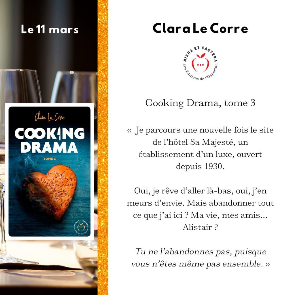 Avis : J’ai beaucoup aimé ce dernier tome, même si, je le reconnais, j’ai eu de la peine pour Alistair 😢. Il se réveille trop tard et ne réagit pas vraiment comme je l’aurais voulu. Il se livre, se dévoile et est enfin prêt à tenter une relation avec Maggy. Manque de bol, elle veut tourner la page et préserver son cœur qui a trop souffert de l’indifférence de son chef. Si l’hôtel Sa Majesté est moins austère que son dernier restaurant, la commis va devoir prendre ses marques et apprendre à connaître les personnes qu’elle va côtoyer à chaque service. Heureusement, dès son premier jour, elle va faire la connaissance de Yenni, le mec qui a des oreilles qui trainent partout et qui la fait sortir. Si on ne sait pas vraiment ce qu’il pense et qu’il a tendance à enjoliver la vérité, il sera là pour remonter le moral de la jeune femme. Certes, elle s’aperçoit qu’elle flashe un peu trop sur son nouveau chef, mais elle ne veut pas se faire de films et ne compte pas prendre ses rêves pour des réalités. Pourtant, avec Johan tout est simple, ils s’apprécient et prennent leur temps. Bien sûr, Maggy n’en oublie pas ses amis laissés dernière elle. Elle appelle toujours Daisy lorsqu’elle a besoin de conseils ou pour lui raconter les (més)aventures qu’il lui arrive. Elle a aussi besoin de se rassurer qu’elle a pris et qu’elle continue de prendre les bonnes décisions. Bien évidemment, comme toujours dans Cooking Drama, il y a des coups-bas sous fond de vengeance. Qui veut nuire à l’hôtel ? Maggy est-elle vraiment prête à laisser un morceau de son cœur à Alistair ? Je vous laisse le découvrir 😉 !