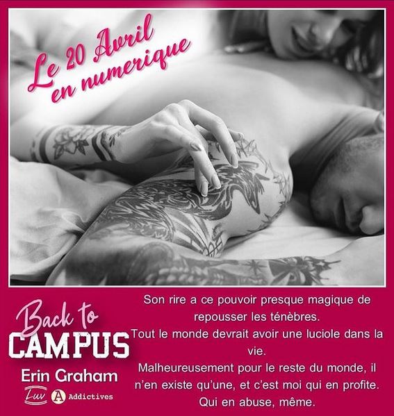Est-ce que j’ai lu le résumé avant de le solliciter auprès de Carole ? Même pas ! Est-ce que je le regrette ? Sûrement pas ! Erin Graham a une plume tellement particulière (dans le bon sens du terme) que je n’ai jamais été déçue et “Back to campus” ne fait pas exception !