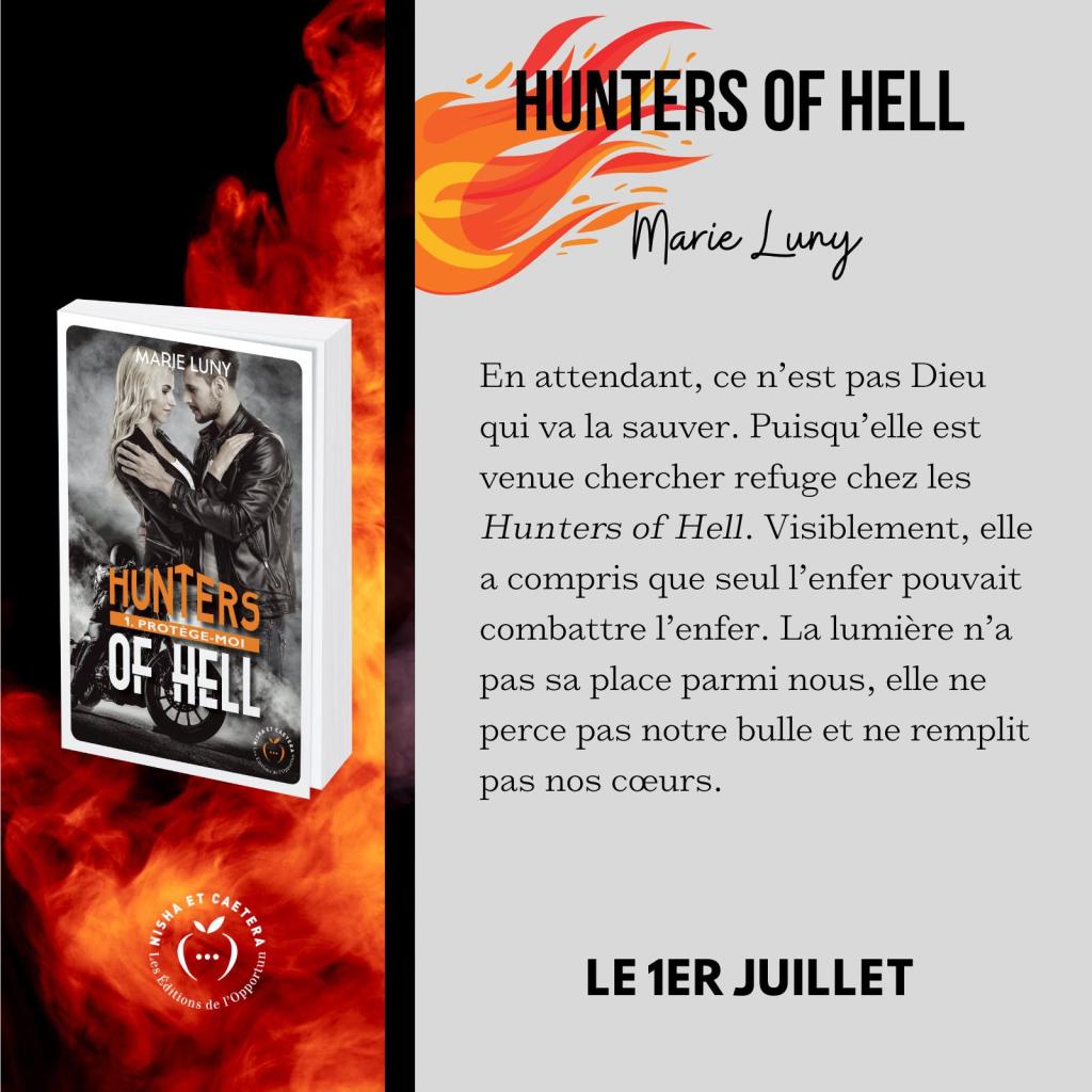 Ce que j’ai aimé … ou pas … : Je l’avoue, j’ai eu peur, peur que Nino aille trop loin, peur que Sora soit trop têtue. Si ces deux-là ont débuté leur vie ensemble, ils ont été arrachés l’un à l’autre et le moins que l’on puisse dire est que l’un d’entre eux ne s’en est pas totalement remis. Alors que dire 1) Sora Marsey a quitté le monde des bikers à la mort de son père. Depuis, la fillette fougueuse a tout fait pour devenir une jeune femme sage. Elle n’emploie plus un langage de charretier (chassez le naturel..) et se comporte bien. Bref, elle est devenue prout-prout 😁 ! Elle a tiré un trait sur les “bad boys” pour ne garder que les chiants à mourir (non ça, c’est moi qui interprète) et a tout fait pour ne pas faire de vagues. Malheureusement, son passé (ou plutôt celui de son père) l’a rattrapé et elle va devoir demander de l’aide à un club où elle ne pensait jamais remettre les pieds. Si les années sont passées, ses souvenirs traversent la grille en même temps qu’elle. Certes, elle réalise qu’elle a oublié son meilleur ami, mais elle ne comprend pas pourquoi il la déteste autant ! Bon, pour tout dire, elle s’en fiche, elle ne compte pas faire de vieux os ici. Une fois son problème réglé, elle retourna à New York et terminera ses études pour devenir conservatrice. 2) Nino Calvin, dit Ice, est le président des Hunters of Hell. Il a repris le commandement au décès de son père et tente de faire au moins aussi bien que lui. Ne lui parlez pas d’amour, il a très vite compris que les personnes qui nous aiment sont capables de nous oublier en un claquement de doigts, du coup, il préfère profiter de la moiteur des brebis pour s’amuser. Cependant, lorsqu’il retrouve son ancienne meilleure amie, cela le dévaste pour mieux le soulager. Il a perdu foi en l’amour à cause de son abandon, mais il ne compte pas la laisser gérer ses problèmes toute seule, surtout quand il découvre qui est derrière la morte de la mère de celle qui a toujours eu une place de choix dans son cœur. Si au début, il combat ses sentiments, par la suite, il décide de se battre contre Sora car maintenant qu’il a retrouvé, hors de question de la laisser filer. Oui, elle a un sale caractère, elle lui répond (même devant ses gars !) mais il est totalement fou d’elle ! 3) Havre Ashker est le vice-président des Hunters of Hell et le meilleur ami de Nino. S’il a usé d’une ruse pour approcher son pote et intégrer le MC, aujourd’hui, il donnerait sa vie pour eux. Havre est plutôt cool, il profite de son statut de VP, des jolis culs, mais n’en oublie ni la politesse, ni ce que cela fait d’être en terrain “ennemi”. Il accueille Sora avec toute la gentillesse dont il est capable et n’hésite pas à foutre en rogne son président pour lui faire réaliser ses sentiments. Il est même prêt à se dévouer corps et âme pour faire avancer le merdier dans lequel les bikers se trouvent.