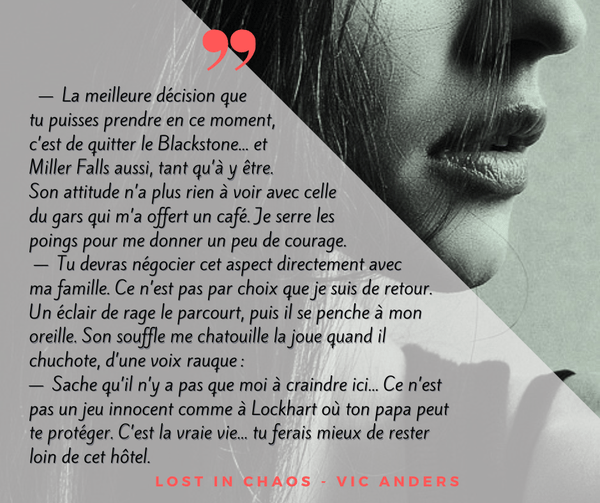 Ce que j’ai aimé … ou pas … : Au lycée de Miller Falls, tout n’est qu’illusion. Derrière chaque (faux) sourire se cache un secret ou un mal-être qui ne demande qu’à être révélé. Alors que dire … 1) Malgré les événements, Evelyn Sinclair avait trouvé une certaine stabilité dans sa vie au pensionnat de Columbus. Si elle a dû montrer les dents en arrivant, elle avait réussi à faire oublier qui était son père. Manque de chance, tous ses efforts sont balayés lorsque sa mère lui apprend qu’elle fera sa dernière année de lycée à Miller Falls. Retour à la case départ sans préavis ! La jeune femme ne se fait aucune illusion et sait que le retour dans sa ville natale sera compliqué. Malgré tout, elle ne s’attendait pas à tant de haine de la part de ses camarades. Certes, elle sait se blinder face à toutes ses attaques, mais subir des intimidations quotidiennes la force à attaquer la première. Pour cela, elle peut compter sur Rachel (on en parle très vite) mais surtout, elle va pouvoir en apprendre plus sur Chase grâce à son nouveau job… à moins que ça ne soit son soudain rapprochant avec lui. 2) Chase McKinley est aussi beau qu’impulsif, ce qui fait de lui, une bombe à retardement. S’il arrive à se contrôler, il lui arrive d’envoyer quelques coups de poing par-ci, par-là. Il en veut personnellement à la famille Sinclair et il compte bien le faire comprendre au seul membre de la famille qu’il fréquente. Malheureusement pour lui, il sait que la jeune femme a des billes pour rendre chacun de ses coups (au sens figuré du terme). Il compte tout faire pour qu’elle ne découvre aucun de ses secrets, quitte à devoir monter d’un cran dans l’intimidation. Cependant, son attraction pour elle pourrait le mettre dans des situations, disons répréhensibles par ses potes 😉. 3) Rachel Parker est l’une des seules personnes à tendre la main à Eve, ou la seule à oser dire qu’elle admire la ténacité de la demoiselle. Ces deux-là vont rapidement devenir amies et Rachel compte bien tenter de minimiser les attaques de ses camarades. Elle reste à ses côtés et lui raconte quelques potins afin que tous ces étudiants descendent de leur piédestal.