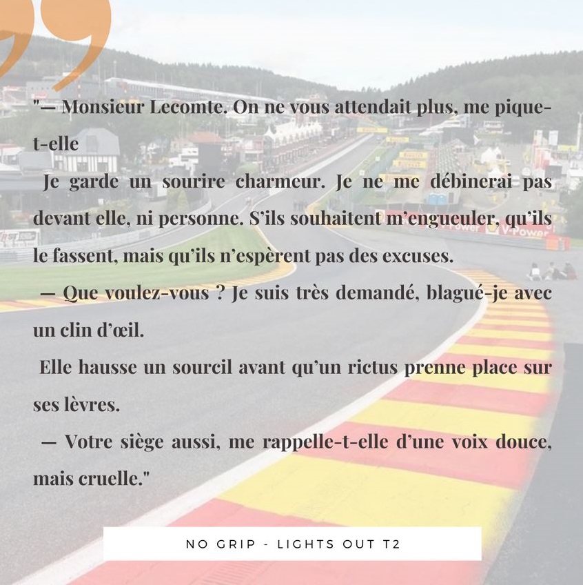 Ce que j’ai aimé… ou pas … : Le plot twist, dont personne ne s’attendait dans le premier tome, a des répercussions sur ce second tome ! Si le deuil est personnel, certaines personnes ont besoin de sombrer avant de remonter à la surface… Alors que dire 1) Mathieu Lecomte défraie la chronique depuis la mort de son meilleur ami. S’il sait qu’il part en vrille, il est, pour le moment, incapable de faire marche arrière. Il a besoin d’oublier et le seul moyen qu’il connait ne plait clairement pas à son écurie. Pour ne rien arranger, il s’éloigne de ses copains, qui lui rappellent trop que Mike ne s’alignera plus sur la ligne de départ. Même si le pilote se moque bien des conséquences de ses actes, il sait qu’il a des comptes à rendre à Keelean. Malheureusement, il ne s’attendait pas à être puni comme un gamin 😁. S’il tente de faire de l’humour, de montrer sa désinvolture, il sait qu’il doit se reprendre avant de perdre son siège. 2) Nell MacArthur est la fille de Don MacArthur, le propriétaire de l’écurie Keelean. Si elle ne porte ni la F1, ni l’écurie dans son cœur, elle ne peut décemment pas tourner le dos à son père. En effet, ce dernier lui a demandé de reprendre les rênes le temps de régler quelques affaires… La jeune femme avait d’autres projets en tête, mais, pour le bien de tout le monde, elle suit les directives. Malgré tout, elle ne compte pas faire ami-ami avec Matt. Il y a trop en jeu pour le laisser se crasher en dehors de la piste. Elle compte bien lui montrer qui est la boss 💪 et ni ses cadeaux, ni ses sourires pourront la faire changer d’avis … 3) John Lowe connaît parfaitement l’équipe de Keelean. Il est d’ailleurs l’un des seuls à connaitre la vérité sur la raison de la présence de Nell. S’il est du côté des pilotes, et notamment Matt, il est l’un des rares soutiens de la jeune femme. Il lui explique les stratégies, l’accompagne aux différentes réunions, l’épaule du mieux qu’il peut tout en connaissant le ressentiment de la fille du propriétaire.